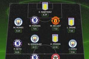 中场:内托(切尔西)、尼科-冈萨雷斯(曼城)、奥纳纳(维拉)、多库(曼城)