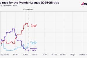 英超夺冠概率走势:利物浦从领跑跌至7%,目前阿森纳64%曼城23%