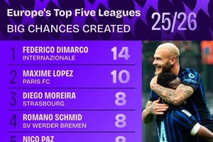 本赛季五大联赛创造重大机会榜:迪马尔科14次居首,帕斯8次第三